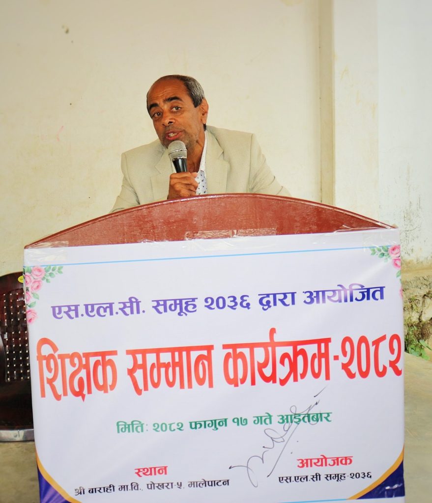 पोखरा, १८ फागुन । पोखरा मालेपाटनमा रहेको श्री बाराही माविका पूर्वविद्यार्थीले शिक्षकहरुको सम्मान गरेका छन् । वि।सं। २०३६ सालमा एसएलसी दिएका पूर्वविद्यार्थीको समूहले आफूलाई अध्यापन गराउने शिक्षकहरुको सम्मानमा सो कार्यक्रम आयोजना गरेका हुन् ।