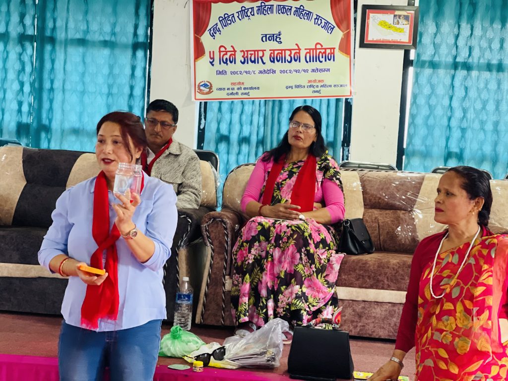 द्वन्द्व पीडित राष्ट्रिय महिला (एकल महिला) सञ्जाल तनहुँको आयोजनामा ५ दिने अचार बनाउने तालिम आइतबारदेखि सुरु भएको छ।तालिम ब्यास नगरपालिकाको सहयोगमा सञ्चालन गरिएको हो।चैत ८ गतेदेखि चैत १२ गतेसम्म सञ्चालन हुने उक्त तालिम क्षेत्री समाजको भवनमा भइरहेको छ। तालिममा ३० जना द्वन्द्व पीडित एकल महिलाहरूको सहभागिता रहेको छ।